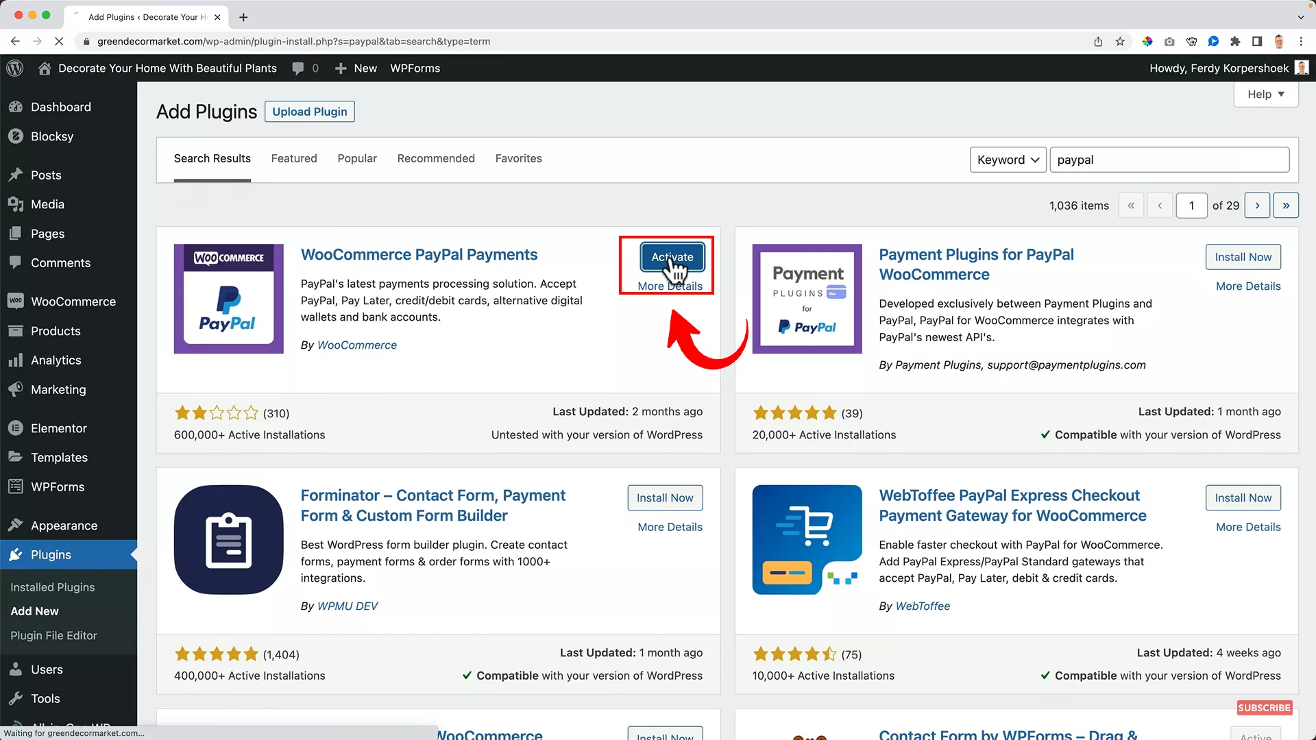 To set PayPal as a payment method, install and activate the “WooCommerce PayPal Payments” Plugin from the plugins library on WordPress.