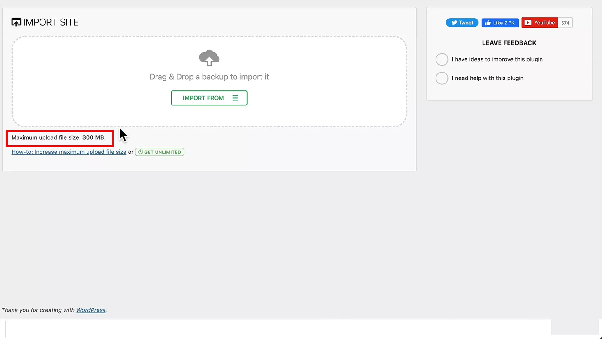 With this plugin installed and activated, you can import websites significantly larger than before, depending on your server’s capacity. If you still encounter limitations, contact your web hosting provider to increase your capacity.