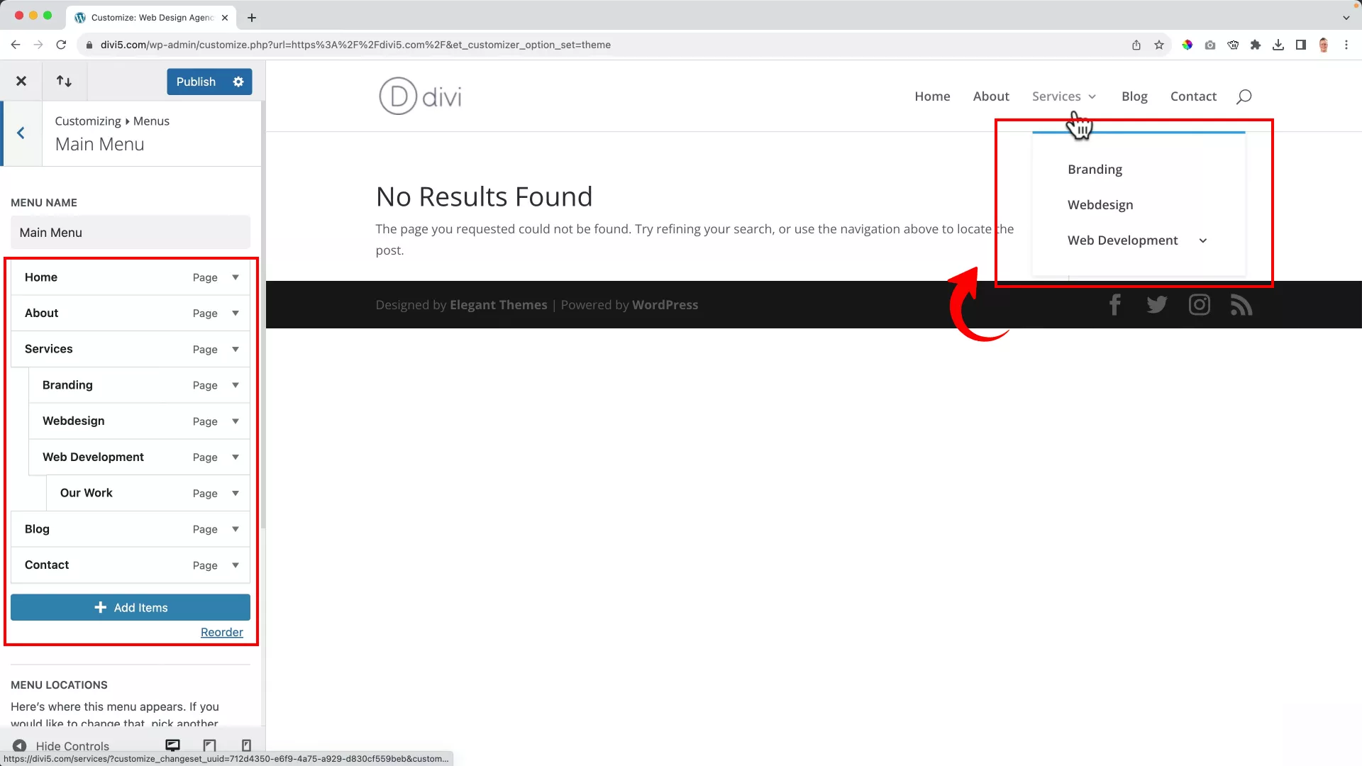 To add drop-down items in the menu, drag the desired pages or categories slightly to the right under their parent menu item.